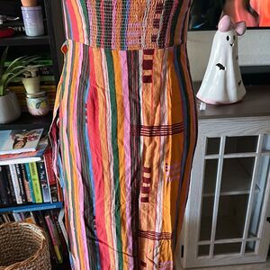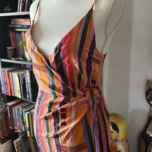Vibrant striped midi dress. Wrap style with a flattering fit. Perfect for casual outings.