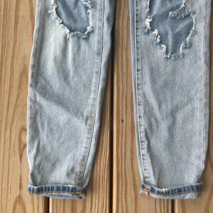 Awesome jeans by BDG for Urban Outfitters. Mom high rise jean in a lighter wash with intentional distressing throughout. Large holes and rips as shown in photos.