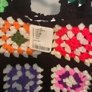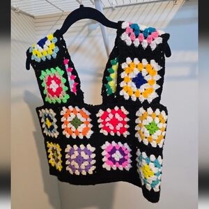 Crochet tank top from THE SERIES, featuring multicolored squares stitched together for a bold aesthetic. Cut in a boxy silhouette with a straight neckline, matching back and thick shoulder straps. Crafted exclusively from renewed and reworked pre-existing materials.