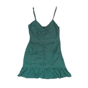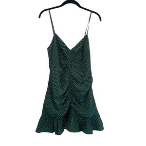 Urban Outfitters New With Tags Green Polka Dot Cinched Mini Dress Size Medium Size: Women's Medium Color: Green w/white polka dots Retro-inspired mini dress from Urban Outfitters topped with an allover polka dot print. V-neck design features ruched detailing at the cinched front and a ruffled mini-length hem. Complete with adjustable spaghetti straps and smocked panel at the back for a comfortable fit. 100% Polyester Lined Side Zipper