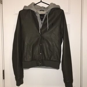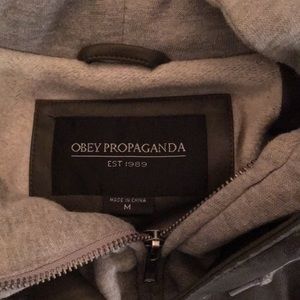 OBEY PROPOGANDA jacket from Urban Outfitters. Dark green leather with grey hoodie. Super cute and warm!