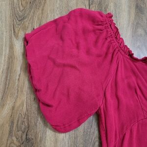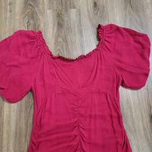 Urban outfitters off the shoulder ruched puff sleeve mini dress in Raspberry pink color.
