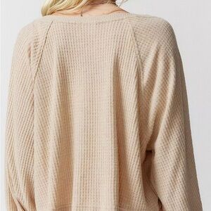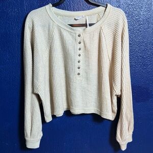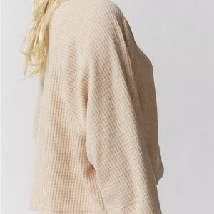 This cream blouse from Urban Outfitters features a relaxed fit with long sleeves and a waffle texture. The buttoned front adds a touch of style to this versatile top, making it perfect for casual outings.
