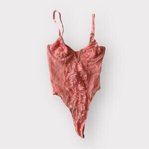 Luxe lingerie in this bodysuit by Out From Under. This slim-fitting one-piece is cut from a sheer lace fabrication with a delicate floral pattern and dotted panels to sides. Features underwired cups with a V-slit detail to chest, adjustable bra straps, hook-and-eye closure to reverse, a cut-out panel to back and thong coverage to finish. Only at Urban Outfitters. Brand new without tags in size S.