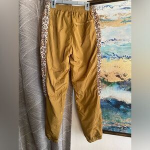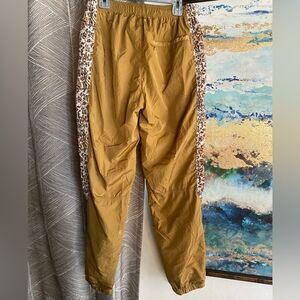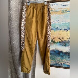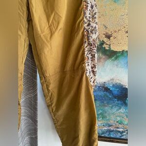 Mustard pants with a floral print on the sides and elastic at the ankles. gently used pants in excellent condition