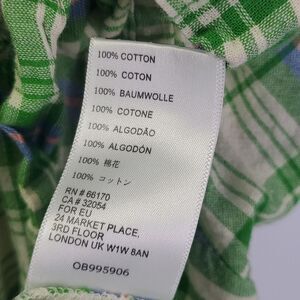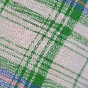 Features: green plaid print, lightweight fabric, halter neck, mini length
