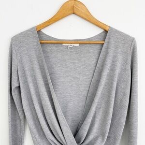 Urban Outfitters Project Social Gray Waffle Faux Wrap Long Sleeve Top. Deep V- neckline. Long sleeves. Pullover styling. Waffle knit. Wrap front.