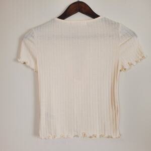 Short sleeved ribbed baby tee style cropped tshirt in cream / off white with a criss-crossed lace-up deep V plunge neckline. Ruffled lettuce hem trim along the sleeve openings and bottom. Semi-sheer material - would need to be worn with nippies/pasties to make it less see through.