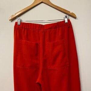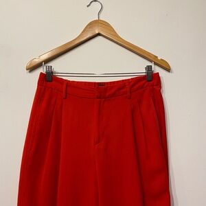 Bright red high waisted dress pants. Pleated front. Slight barrel leg cut. Unlined. In good condition, some stressing on the pleats, shown in the photos. Size medium.