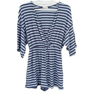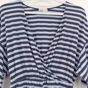 Urban Outfitters Light Blue Striped Ribbed Knit Surplice Romper V-Neck Crossover Front Half Sleeve Pull On Lightweight Stretch Women's