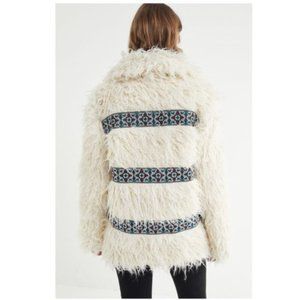 Rosa Faux Fur Coat S. Fuzzy faux fur coat from Urban Outfitters made from a textured faux fur fabric in a relaxed, long-line silhouette. Features embroidered geo-patterned fabric for striped detailing; hook + eye front closure; pointed collar.