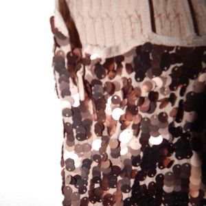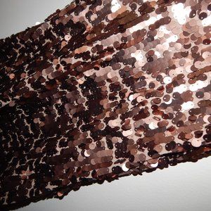 Bronze. Rose Gold. Sequin. Deep V Front. Crisscross Back. Zippered Back. Mini Dress. I am 5'-2" and it hits two inches below bottom. Worn Once.
