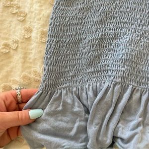 Cute steel blue tank top. Ruched material on top with ruffle, babydoll bottoms, flattering wide straps.