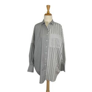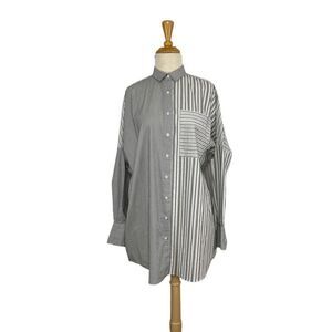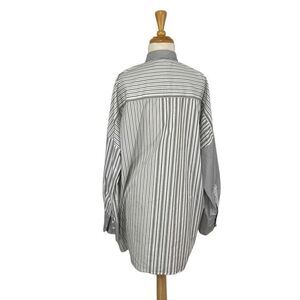 Oversized big shirt in asymmetric varied patterns of gray pinstripes on white. One right breast pocket.