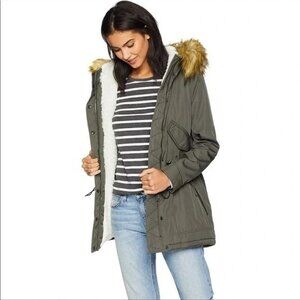Funnel neck - Long sleeves with zip closure cuffs - Front hidden snap button with hidden zip closure - Detachable hood with faux fur trim - 2 chest flap pockets - 2 front zip slash pockets - Sleeve zip pocket - Toggle waist, hem, and hood - Back vent Lined