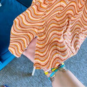 Out From Under Sand Dollar Romper in the color Assorted, a groovy wavy / wave pattern in a mix of shades of peachy coral pink, mustard yellow, white, and deep burnt red. The look has a 70s hippie / surf / skate beach vibe that I love!