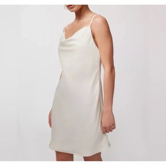 Keywords: satin dress, slip dress, cowl neck, mini dress, sleeveless, party dress, cocktail dress, wedding guest dress, white dress, satin mini dress, spaghetti strap dress, minimalist dress, bias cut dress