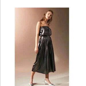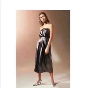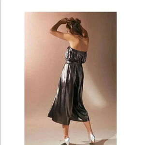 Who needs a disco ball when you have this shiny strapless jumpsuit from Urban Outfitters. Made from a super shiny fabrication in a fit and flare silhouette. Topped with a strapless banded upper and relaxed-fit bodice. Features a banded waist and high-rise, cropped wide-leg pleated bottom. Polyester. Color: metallic