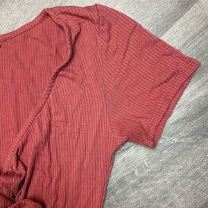 Urban Outfitters Short Sleeve Tie Front Bodycon Maxi Dress. Ribbed. Slits on bottom. Midi to maxi length. Size S. 96% rayon, 4% spandex. Some discoloration near under arms but still in good condition.