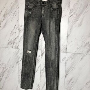 Perfect the laid-back babe look in these distressed denim skinny's by Silence + Noise (An Urban Outfitters brand). In a cigarette leg silhouette that hugs through the ankle, this piece features a gorgeous gray faded wash, understated distressed detailing at the knee, & classic 5 pocket & button zipper fly at the front.