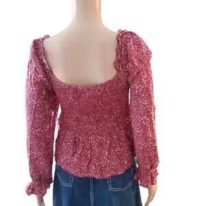 Chic and feminine Urban Outfitters women’s blouse in size Large. Features a flattering smocked bodice with ruffle trim, square neckline, and scoop back. The long sleeves are slightly puffed with smocked cuffs, and the peplum hem gives it a flowy, flattering shape. Lightweight rayon fabric with a ditsy floral print in raspberry red, white — perfect for layering or wearing on its own.