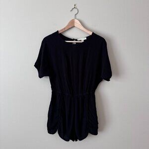 Great basic romper that is perfect for the beach, holidays or to wear on summer days. Shorts with an open back and draped sleeves style. Shorts have ruched seam, waist is elastic. Pull on style with a back, neck button close. In excellent preowned condition with no major flaws to note. No rips, stains or tears. Size M. See photos for measurements and details.