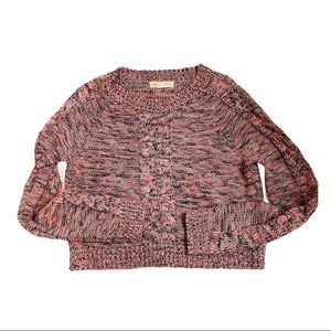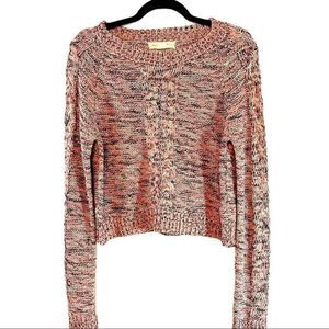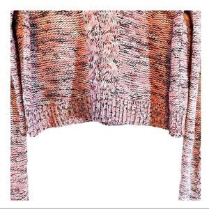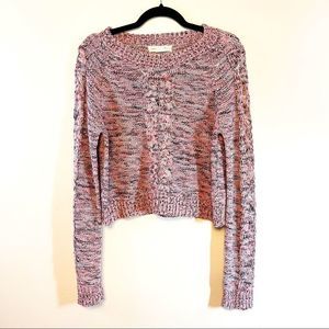 Pink, gray, black knit material. Long sleeves crop top with a crew neck. Beautiful and cozy!