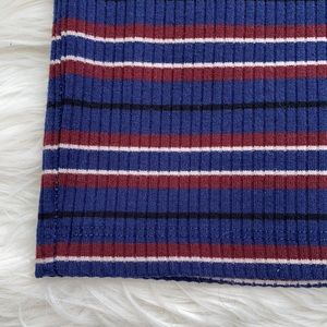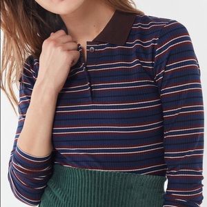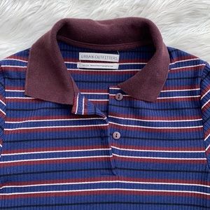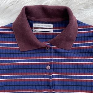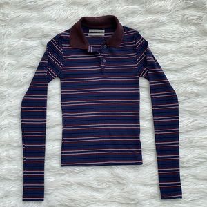 In great used condition. Size extra small. Long sleeve. Collared polo. Buttons down center. Stretchy ribbed material. Dark blue, burgundy, and white color.
