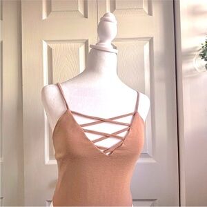 Stylish tan bodysuit with strappy design. Perfect for layering.