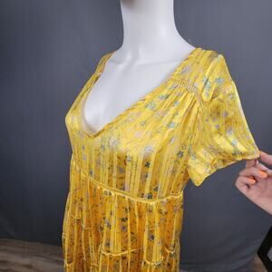 Feminine and effortless, this Urban Outfitters yellow mini dress features a soft crinkled fabric with delicate blue and lavender florals. The relaxed babydoll silhouette, tiered skirt, and V-neckline create a flattering shape perfect for spring and summer. Lightweight and breathable, with a semi-sheer finish ideal for layering over a bralette or slip.