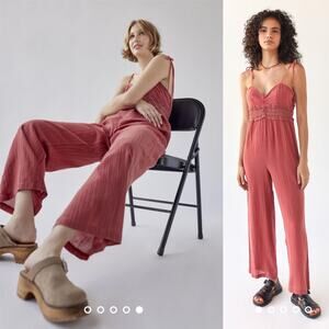 Urban Outfitters Tilly Lace Inset Crochet Boho Gauze Jumpsuit Rust Red Sz S NWT