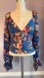 Urban Outfitters Topanga Blue Floral Print Deep V Neck Long Sleeve Cropped Top. Fitted faux button front bustier style top with tie at the bust and smocked back. Long sheer sleeves with frill cuffs.