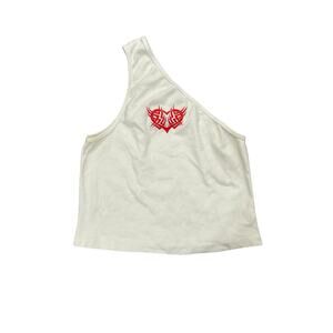 Throwback Y2K vibes! Women’s Urban Outfitters Truly Madly Deeply one-shoulder top. White with bold red tribal heart graphic on the front. Super cute retro club/going out style.
