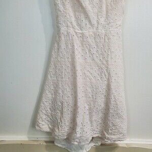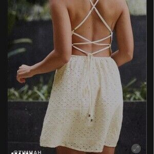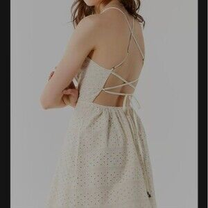 Simply sweet fit + flare mini dress from Urban Outfitters. Made from a soft yet structured cotton that features embroidered eyelet detailing throughout. Topped with a square neckline + thin shoulder straps that lead to a strappy open back with a tie closure. Finished with a lightly pleated mini skirt bottom.
