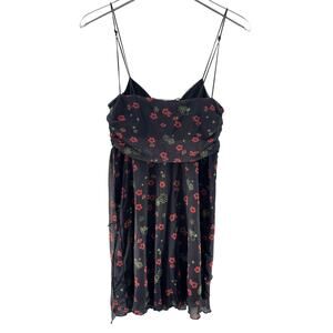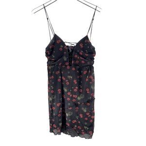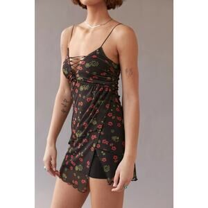 UO Bright Side Lace Up Mini Dress in the color Black Multi, a slightly faded black with red floral print and greenery, and green daisies. A printed mini dress with a mesh overlay. Slim fit. Slit at side reveals the lining underneath. Complete with a lace-up detail at the bust and a notched hem. Adjustable Elastic stretchy spaghetti straps, V shaped Strappy detail at back of the dress. The fabric is stretchy throughout for the perfect form fit! Perfect for a date night, night out with friends with some Strappy heels - or pair with chunky lug sole boots and skinny sunnies for a feminine 90’s grunge look you’ll love!