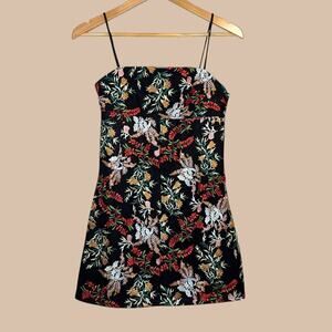 Black mini dress with thin straps and a sheer overlay with beautiful embroidered flowers, back zip. Dress is in perfect condition aside from interior tag.