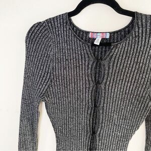 © Details: "Courtnley Metallic Sweater Dress" by UO, a long sleeve mini sweater dress, featuring ribbed metallic knit, a fitted silhouette and an open button-front closure.