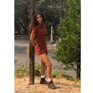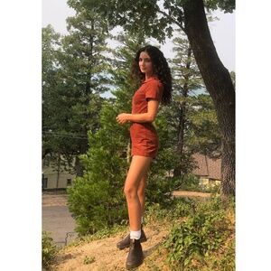 Please see photos for details. Photos are of the actual Urban Outfitters UO Tyson Zi-Front Short Sleeve Romper in Corduroy except model pictures