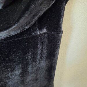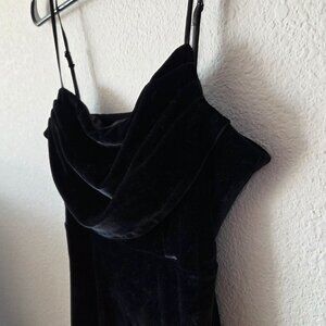 A stylish black velvet mini dress featuring a cowl neckline, adjustable spaghetti straps, and a flattering fit. Ideal for creating a chic, elegant look.