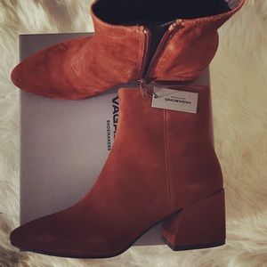 Brand new and never worn ankle boots in beautiful red-brown caramel suede. Based on the west coast of Sweden, Vagabond reworks classic Scandinavian styles with a modern flair. These boots are made for walking. Sleek silhouette with a pointed toe and sculpted heel. Zippers for easy on/off. Soft insoles. Genuine suede. They come in the original box.