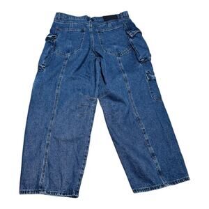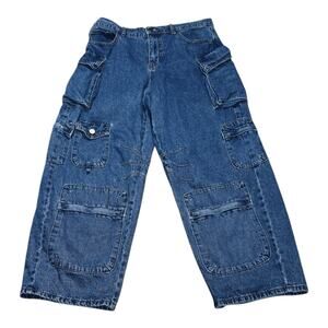 Urban Outfitters Wide Leg Baggy Cargo Utility Jean in a size 29. Has a front zipper and button closure. Numerous zipper and snap closure pockets. Measures approximately 16 1/2” flat lay waist, and 11 1/2” rise, 26” inseam. 100% cotton. In great condition.