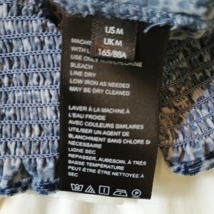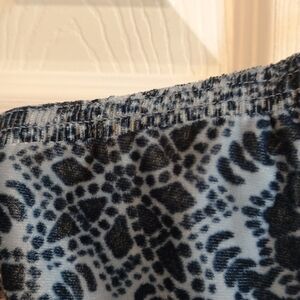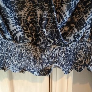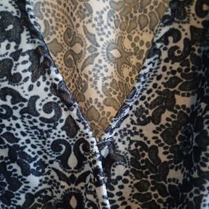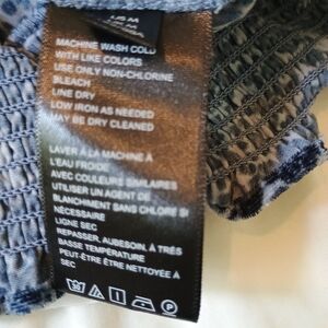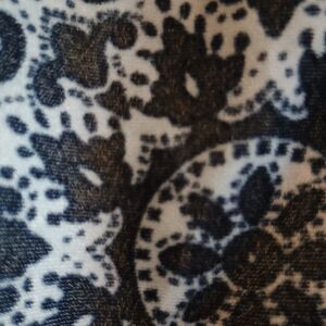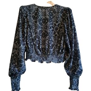 Stunning Urban Outfitters women's Alice in Chains style crop blouse in a beautiful black and blue paisley print. Made from soft polyester with a luxurious velvet-like feel that's lightweight and comfortable. Features deep V-neckline, long sleeves with smocked cuffs, and a cropped silhouette with scalloped hem detail. The Alice in Chains design adds a romantic, ethereal touch perfect for layering or wearing alone for a boho-chic look.