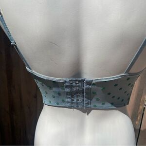 Bustier style crop top made of a mesh fabric for a touch of texture! Underwire cups with bodice piping, adjustable straps, fitted with hook and eye closures at the front and back! Topped with a stunning dusty blue + green clover floral pattern throughout!