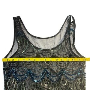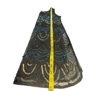 This dress was originally from Urban Outfitters from the earlier parts of the 2000s / 2010. It is a gorgeous blue and black beaded and sequined dress in a scalloped design. It is the sheer overlay that you can make your own - put over a black bathing suit, wear with a sexy bra and underwear set, wear a slip, etc. would be great for a festival, concert, party. Etc.