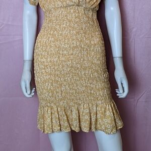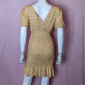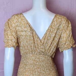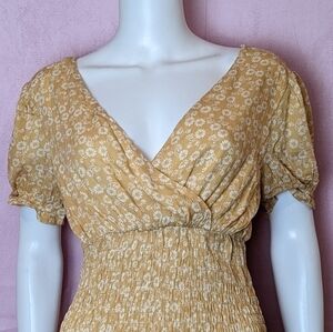 Urban Outfitters Yellow Floral V Neck Smocked Short Sleeve Mini Dress Medium