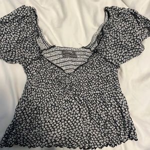 adorable babydoll style top. clinched at the chest creates some cleavage and flares at the bottom. puffy short sleeves. black with white flower/dot pattern.