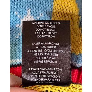 This sweater is 100% Acrylic. Worn 1 time to a Disney Mickey's Very Merry Christmas Party. Washed inside out on the delicate cycle and line dried flat.