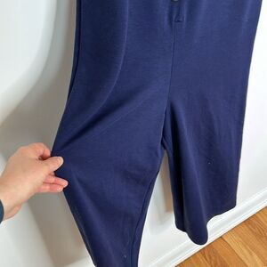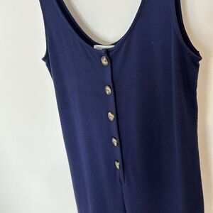 This romper is absolutely adorable! Navy blue colored jumpsuit with buttons down the front. Stretchy and comfortable fabric. From urban outfitters. I am 5’7 and this hits me midcalf. It’s absolutely adorable. Unfortunately just a little bit too small for me. Excellent condition, no flaws are noted.