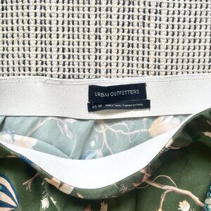 Olive, tan, teal, and yellow floral/ birds patterned slip skirt in a silky material.
