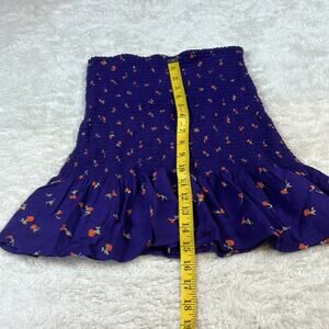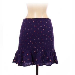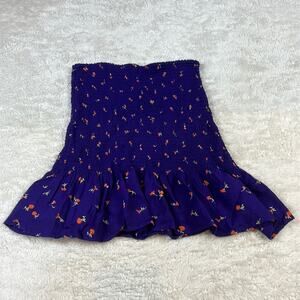 Purple mini skirt with orange floral print features a bodycon style stretch with the smocking.
